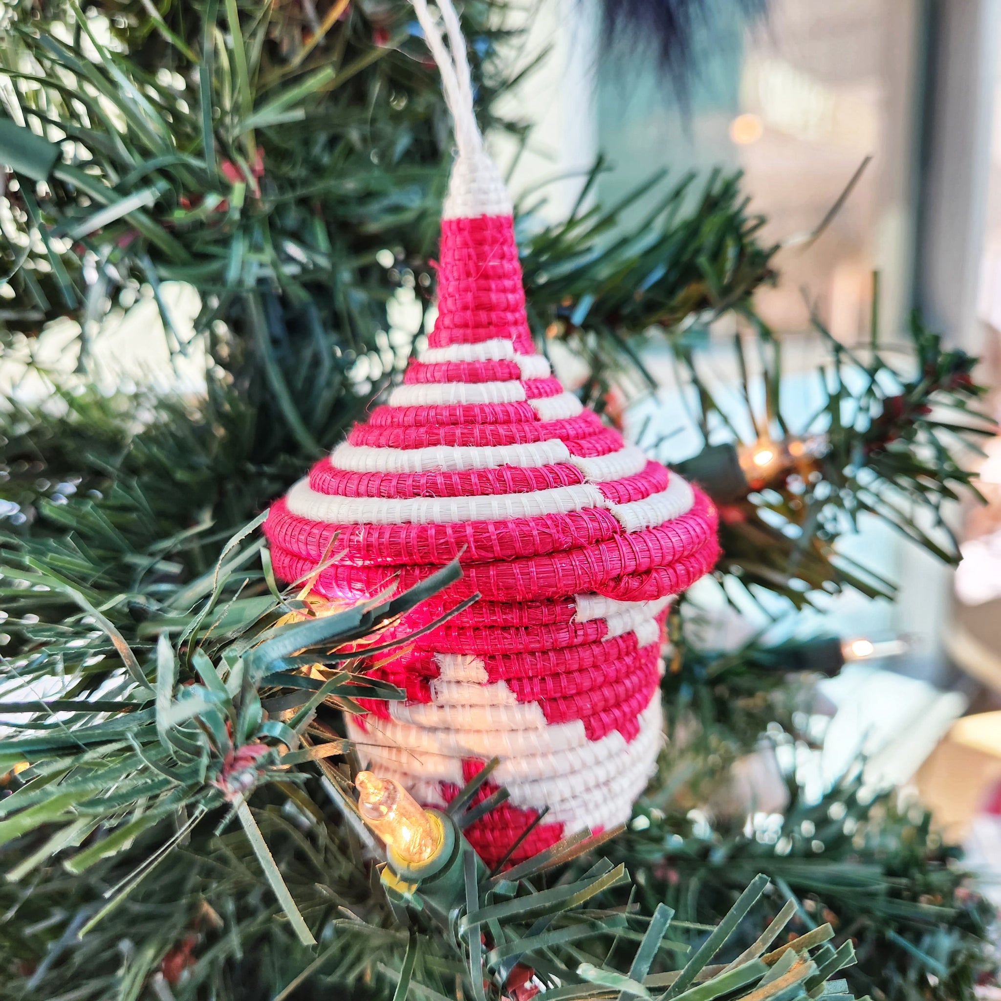 Talented Rwandan basket weavers meticulously transform fine strands of sisal into a beautiful handmade holiday ornament. With a removable lid, and true to the function of traditional Agaseke giving baskets, each ornament serves to hold small gifts or sweet notes. Assorted designs are incorporated using strands dyed to a resplendent red. Because these are handcrafted items, each will vary slightly.